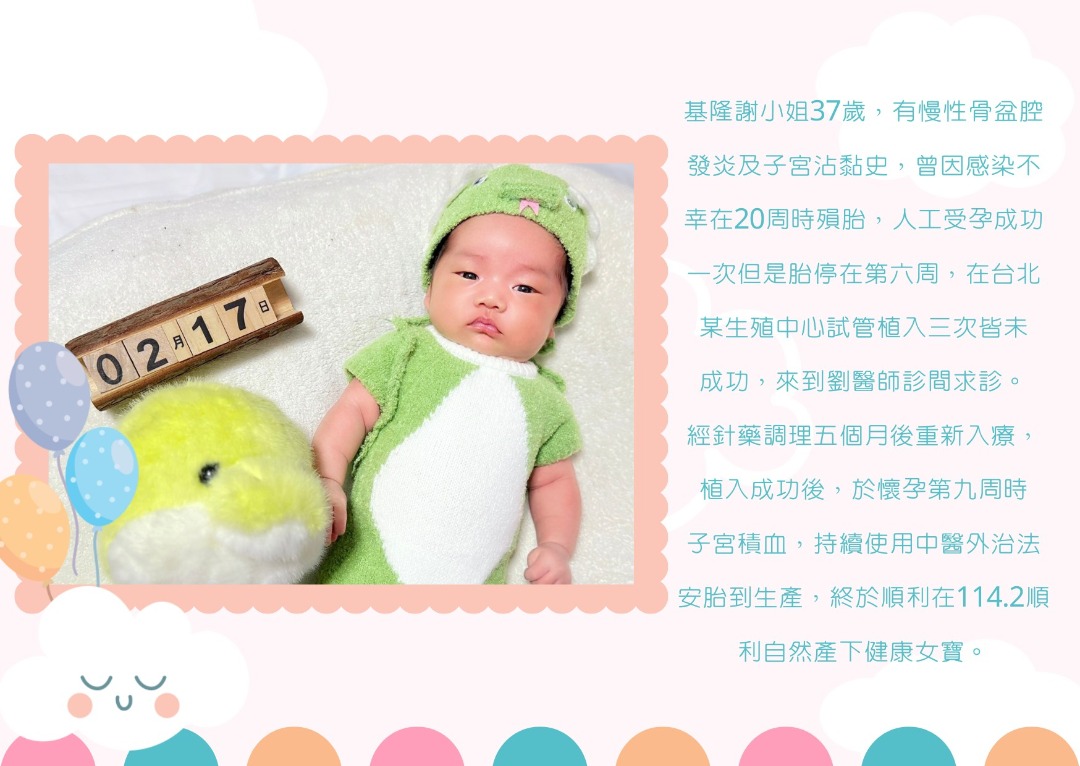 基隆謝小姐37歲,有慢性骨盆腔發炎及子宮沾黏史,曾因感染不幸在20周時殞胎,人工受孕成功一次但是胎停在第六周,在台北某生殖中心試管植入三次皆未成功,來到劉醫師診間求診。經針藥調理五個月後重新入療,植入成功後,於懷孕第九周時子宮積血,持續使用中醫外治法安胎到生產,終於順利在114.2順利自然產下健康女寶。