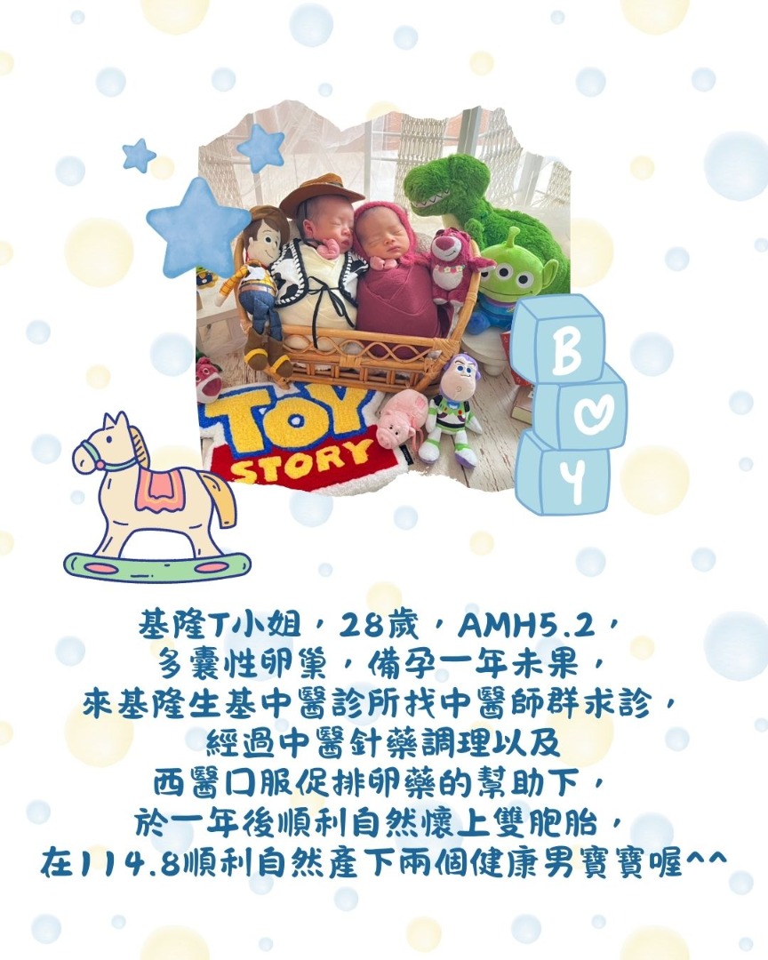 基隆T小姐,28歲,AMH5.2,多囊性卵巢,備孕一年未果,來基隆生基中醫診所找中醫師群求診,經過中醫針藥調理以及西醫口服促排卵藥的幫助下,於一年後順利自然懷上雙胞胎,在114.6順利自然產下兩個健康男寶寶喔^^#劉夢薇中醫師 #基隆 #中醫診所 #袁心容中醫師 #小泉文乃中醫師 #針灸 #埋線 #紅光 #丹田灸 #三九貼 #體質調理 #減重 #備孕 #自然備孕 #中醫備孕 #中醫減重