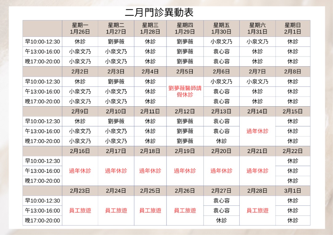 因應夢薇醫師出國,2月門診時間將有以下異動,請大家留意