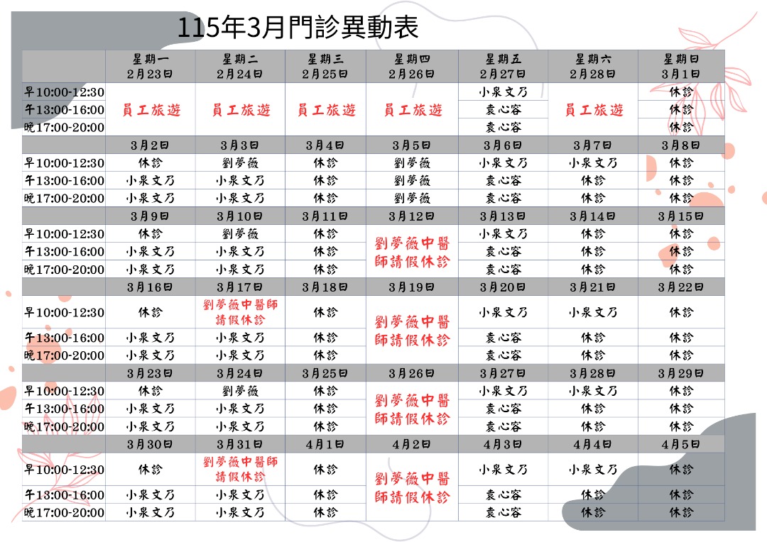 15年3月門診時間異動提醒因應夢薇醫師出國義診放假休養生息,3月門診時間將有以下異動,請大家留意 3/2日小泉醫師回國正常看診 劉夢薇醫師請假休診:3/12、3/17、3/19、3/26、3/31提醒大家注意用藥天數及回診日期;與劉醫師出沒時段🫣,避免錯過看診時機。不好意思造成困擾,謝謝大家的體諒 建議就診前可來電或官方𝗹𝗶𝗻𝗲 確認門診報到時段與醫師看診時間喲 門診異動煩請多加留意休診時段。基隆市仁愛區劉銘傳路1-3號4樓